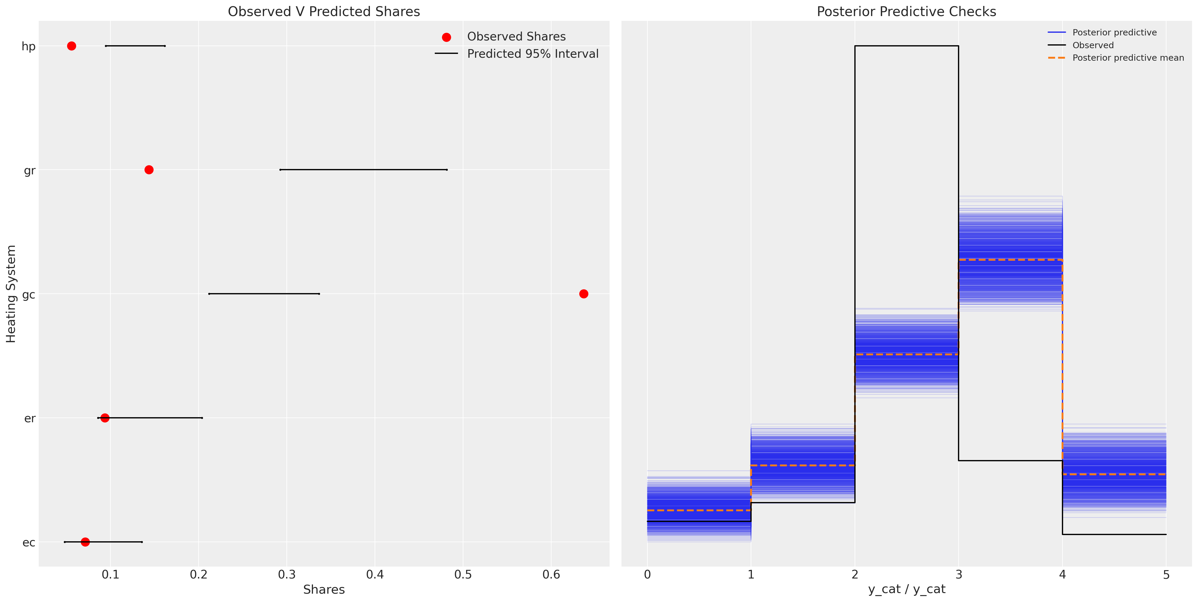 choice_obs = pm.Categorical("y_cat", p=p_, observed=observed, dims="obs")The beta coefficients in the model are interpreted as weights of utility. However, the precision in these latent terms is relative to the variance of unobserved factors.