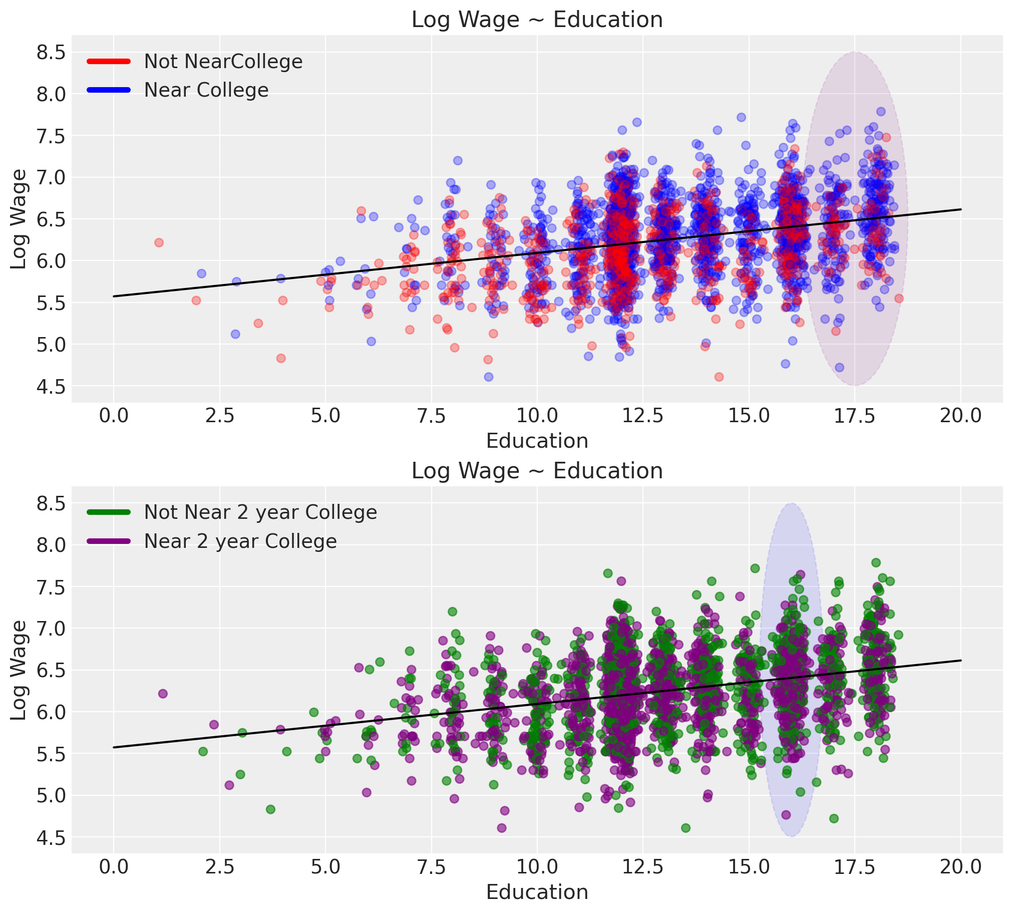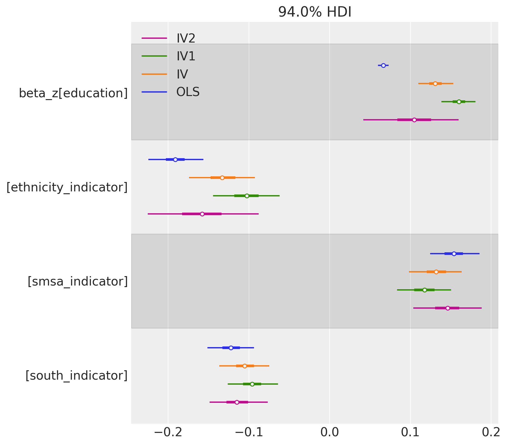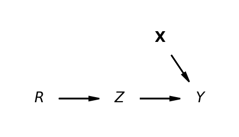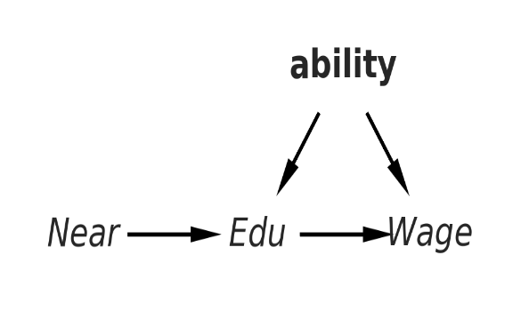 The treatment effect has to be estimated so as to avoid the bias due to X \[ y \sim 1 + \widehat{Z} \] \[ \hat{Z} \sim 1 + IV \]