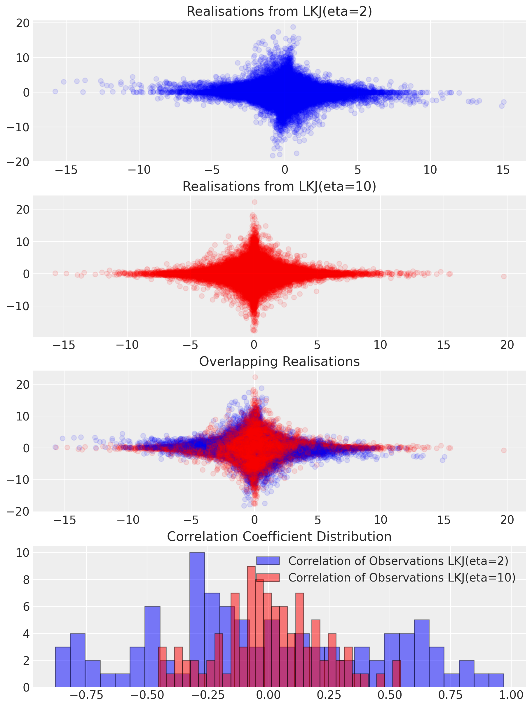 Stronger priors on correlation strength influence the outcomes and can be evaluated against the data through posterior predictive checks