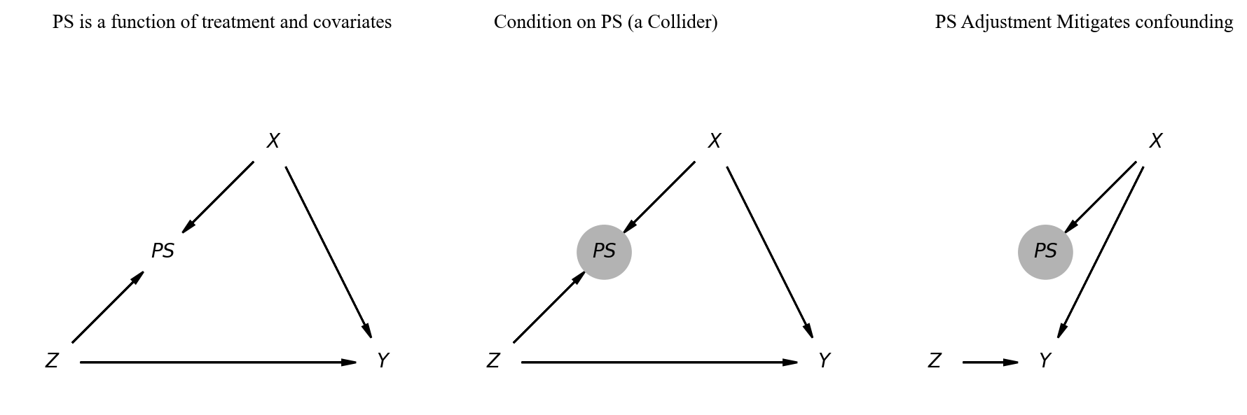 Propensity score adjustments reweight our outcome by the probability of treatment \[ y \sim f(p(Z), Z)\]