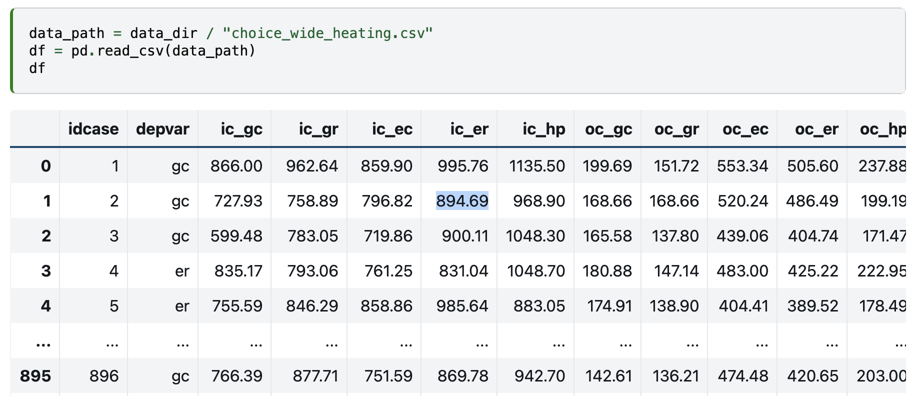 MNLogit with Wilkinson-style formula interfaceThe probability of choosing alternative \(j\) follows the elegant logistic form: