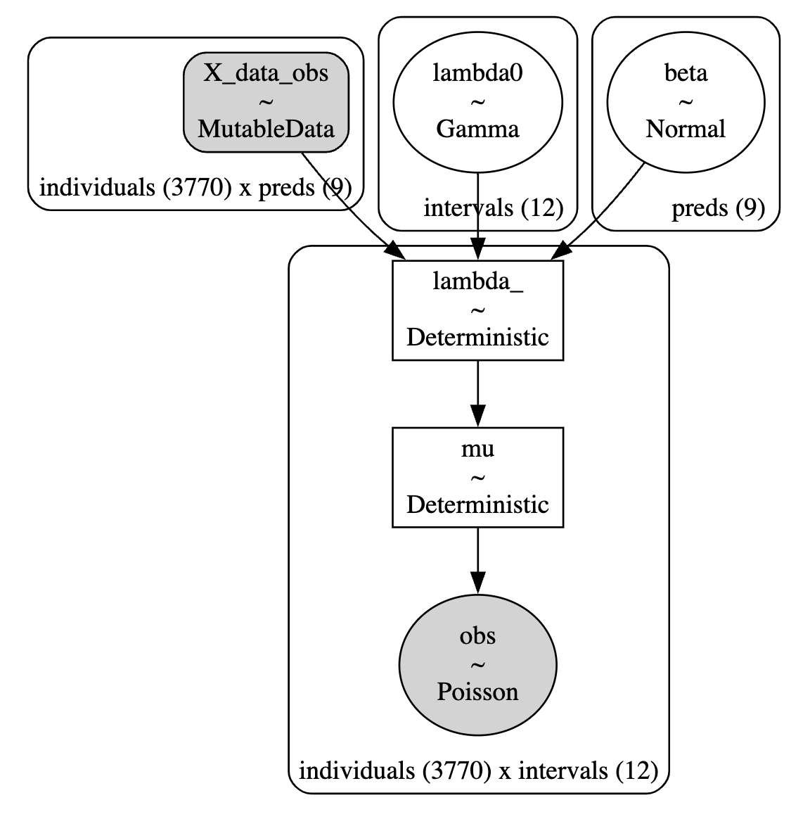 mu = pm.Deterministic("mu", exposure * lambda_, dims=("obs", "intervals"))