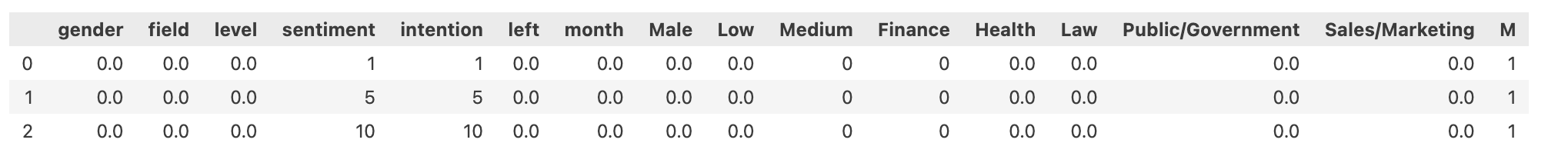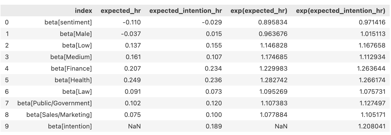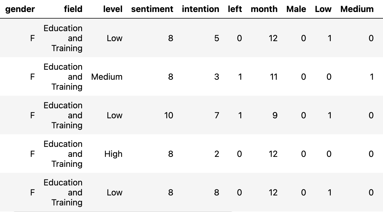 \[ CoxPH(left, month) \sim gender + field + level + sentiment + intention \]
