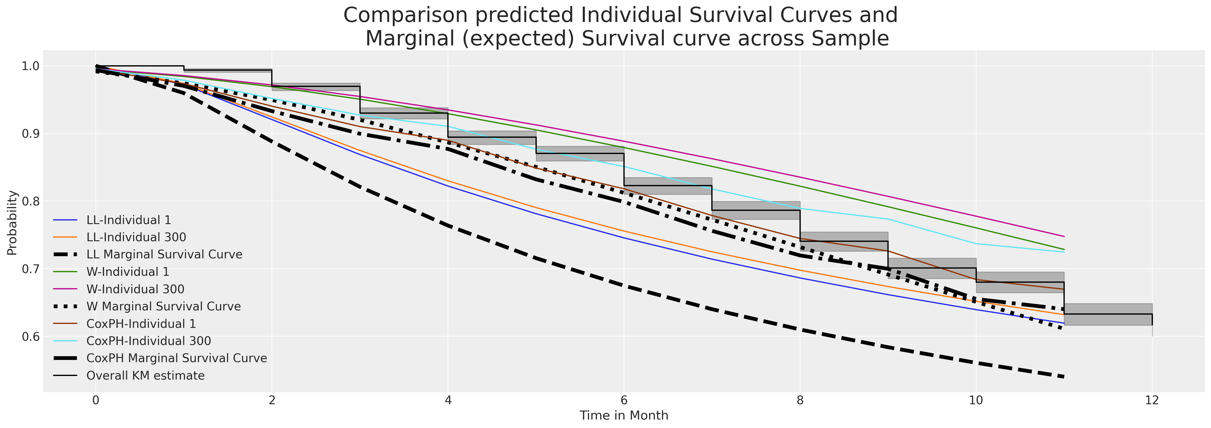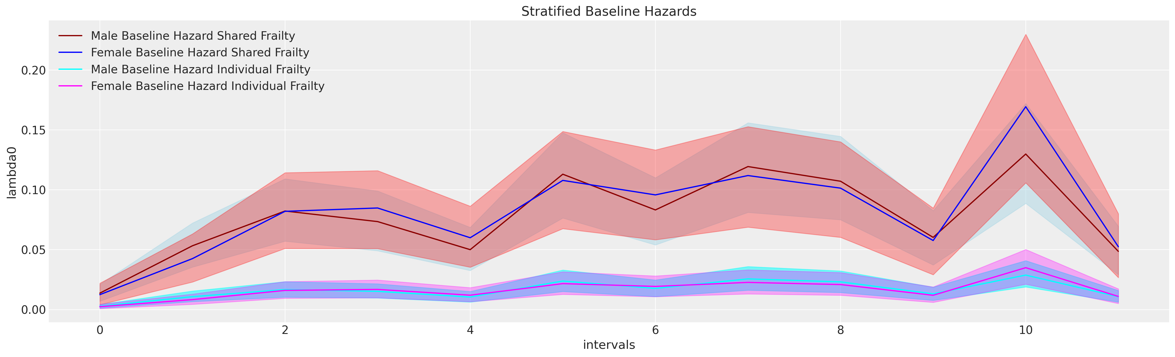 We see differences in the risks stratified by gender and additionally how the magnitude of the baseline hazard shrinks with more or less well-specified covariate in the model.