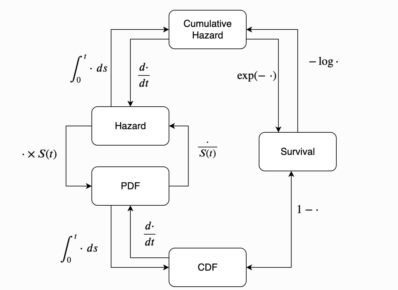\[ h(t) = \frac{f(t)}{S(t)} \\ H(t) = -ln(S(t))\]