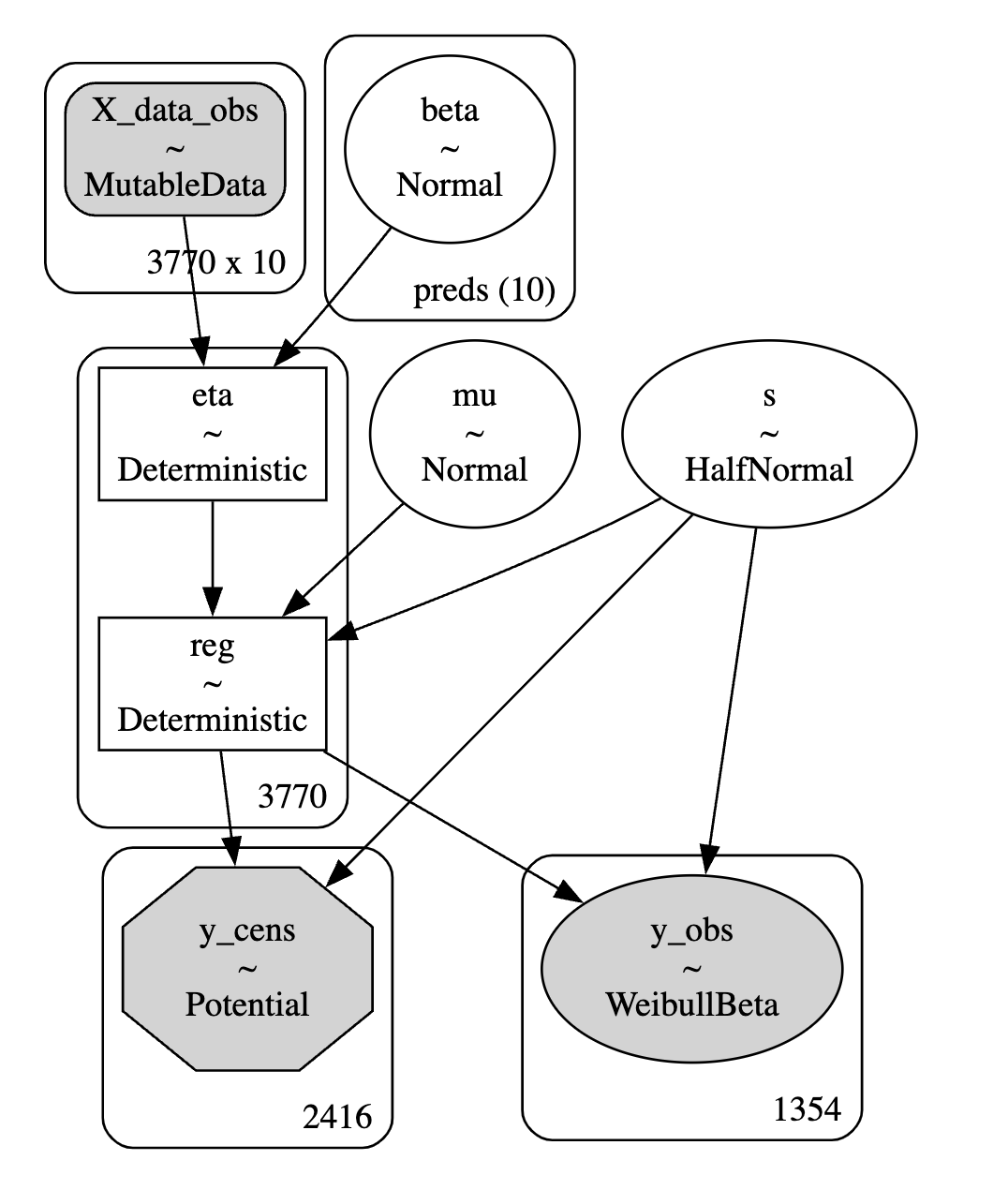 y_cens = pm.Potential("y_cens", weibull_lccdf(y[cens], alpha=s, beta=reg[cens]))